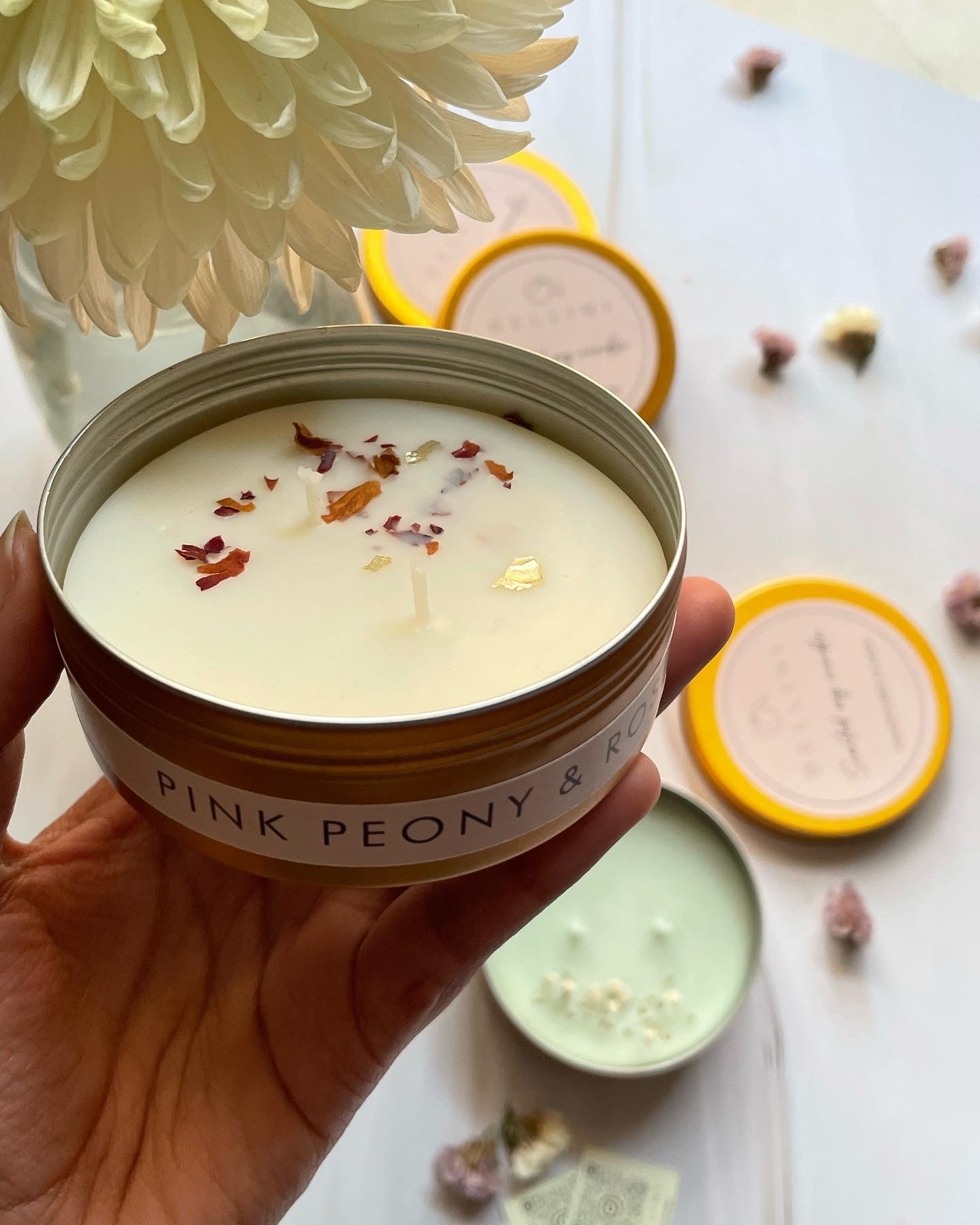 Whether you’re jet-setting, gifting, or simply craving a touch of floral luxury, our Pink Peony and Rose Soy Candle in a convenient travel tin is the perfect choice for fragrance lovers on the go.